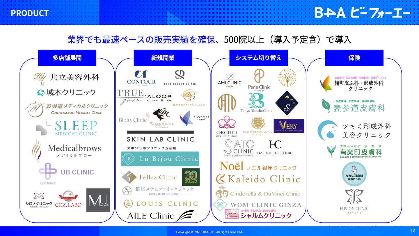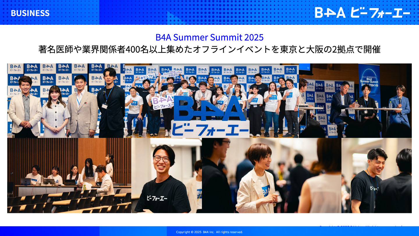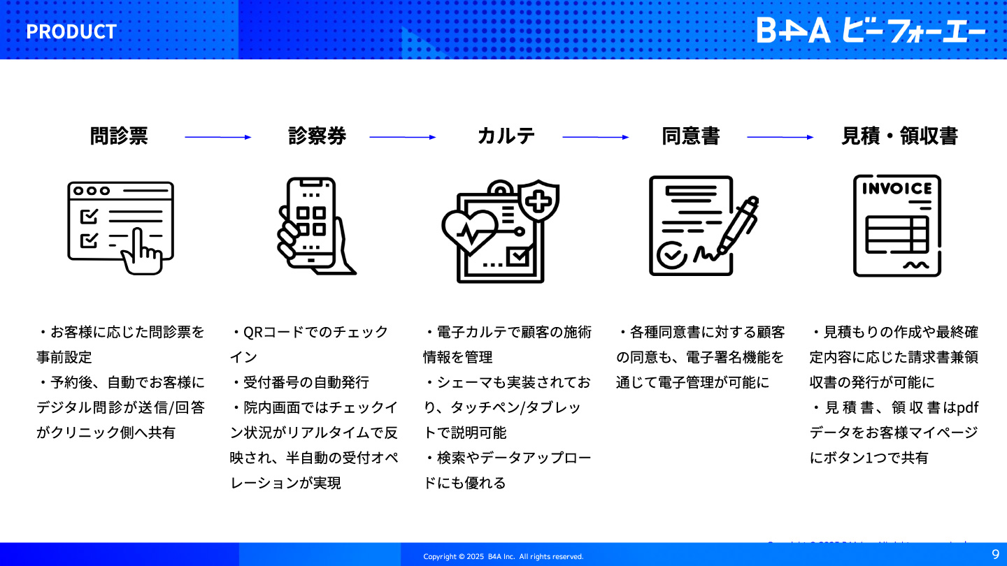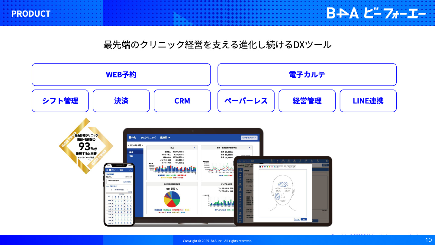 デジタルとノウハウの融合により生まれたB4A(ビーフォーエー)は、自由診療領域における基幹システムの決定版です。クリニックの予約・顧客情報管理・データ分析などあらゆる業務をデジタル化。キャッシュレスやペーパーレスしかり、顧客のあらゆる情報を可視化〜マーケティング活動にも活用できる、自由診療領域ならではの革新的な機能をバンドルしています。