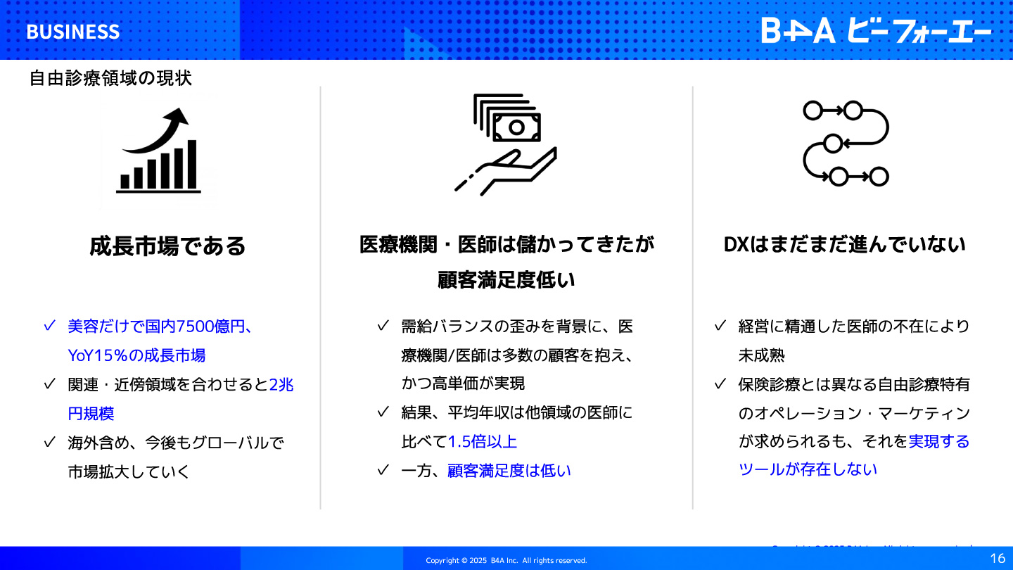 ポテンシャルはあれど、多くの課題を抱える自由診療領域において、医療機関・患者双方にとって、アクセシビリティが高く、フリクションの少ない、「当たり前」の世界を創出したい。